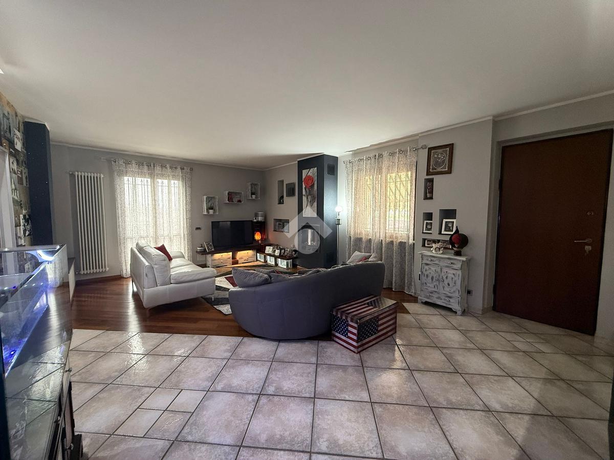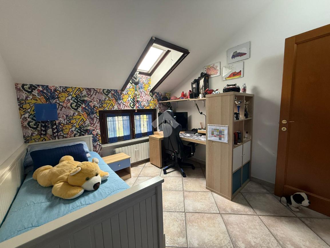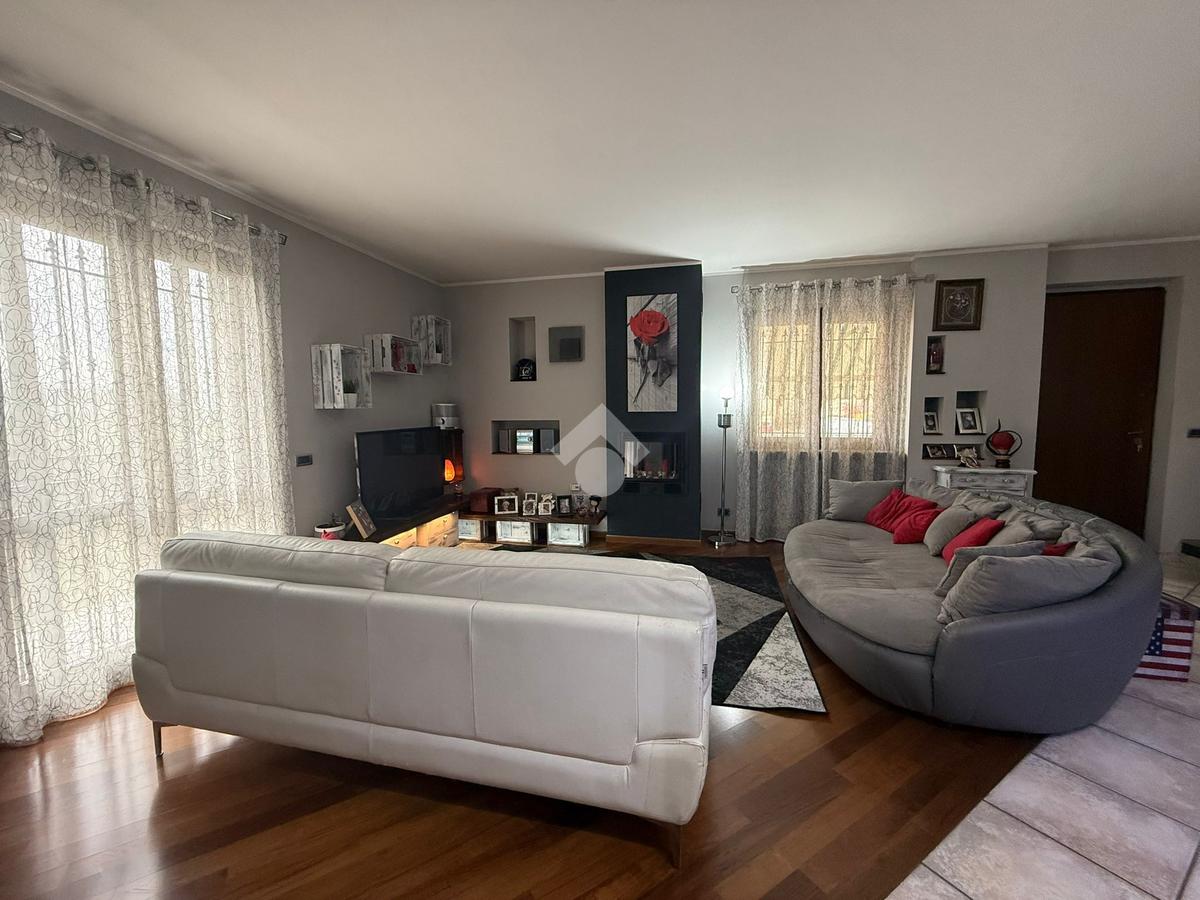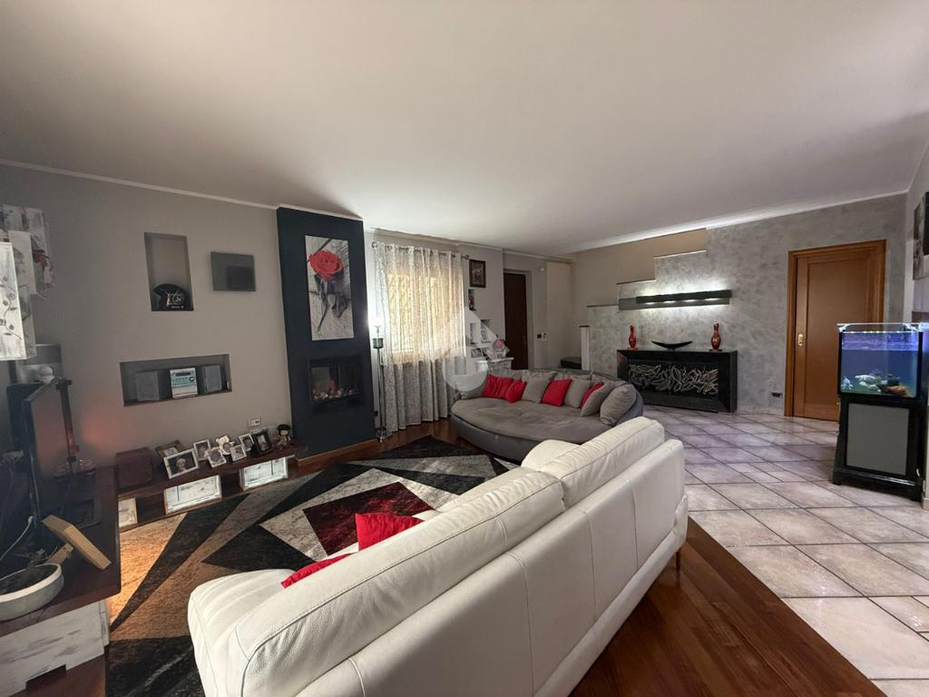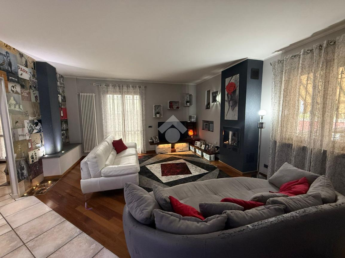 La villa è di recente costruzione e libera su tre lati. E' situata in una zona residenziale tranquilla e circondata dal verde. L'ingresso pedonale affaccia sul cortile privato e una scalinata accompagna alla porta di ingresso, quest'ultima affaccia sul salone ampio e luminoso dotato anche di camino, questo è diviso dalla cucina che è abitabile e spaziosa e dotata di accesso diretto al giardino con dehor, ottimo per mangiare fuori nei periodi più caldi. Al piano principale è presente anche una cameretta utilzzata come studio. Il bagno è finestrato e di servizio. Al piano primo la zona notte è dotata di tre camere da letto, un bagno e una lavanderia. La camera più ampia è matrimoniale e dotata di porta finestra che la collega direttamente al balcone. Le due camerette sono singole, una più ampia con l'accesso al balcone e una più piccola mansardata. Il bagno è finestrato e dotato sia di vasca che di doccia. Al piano seminterrato la taverna è ampia.
