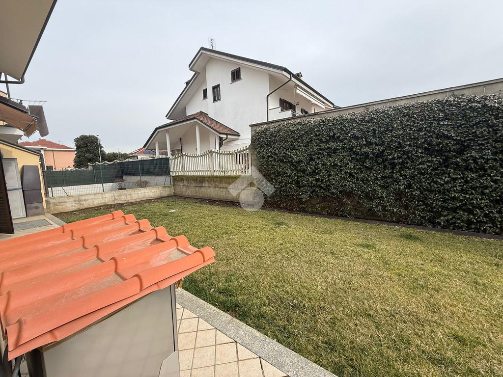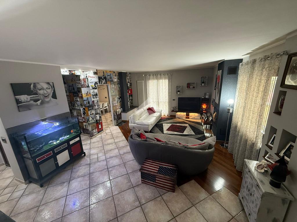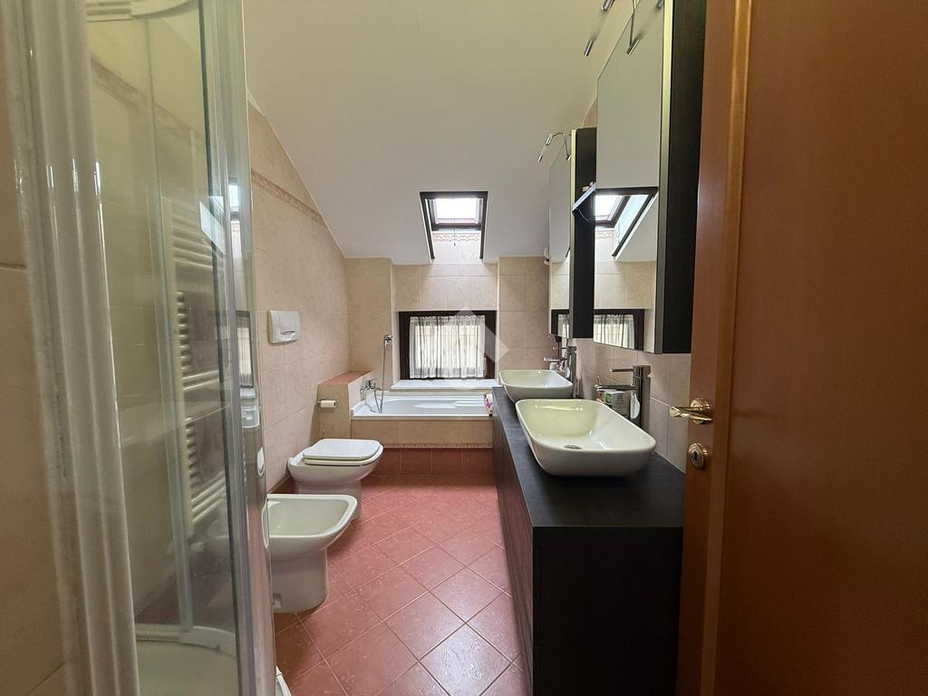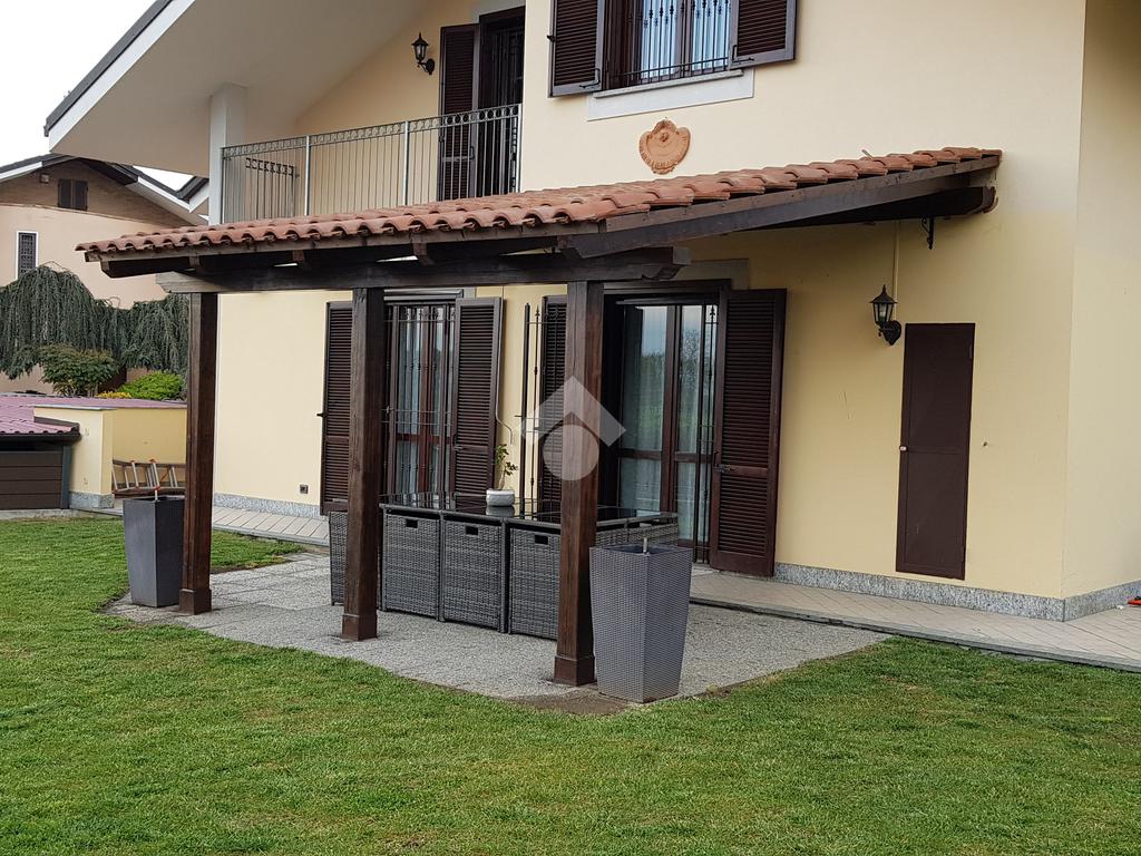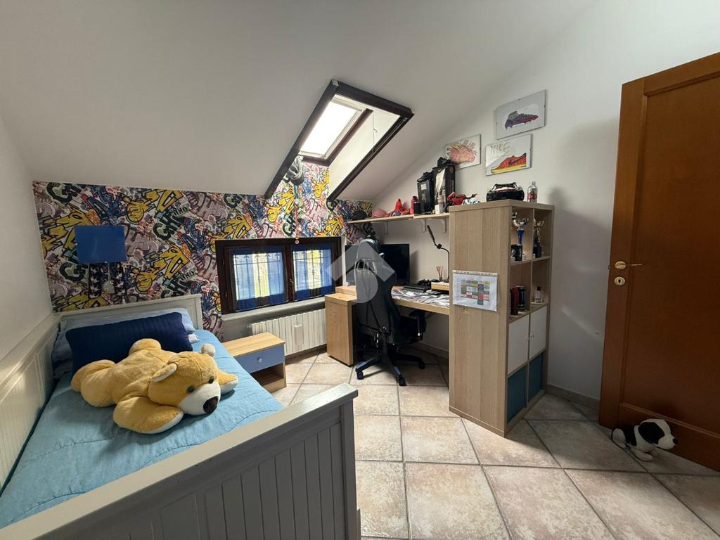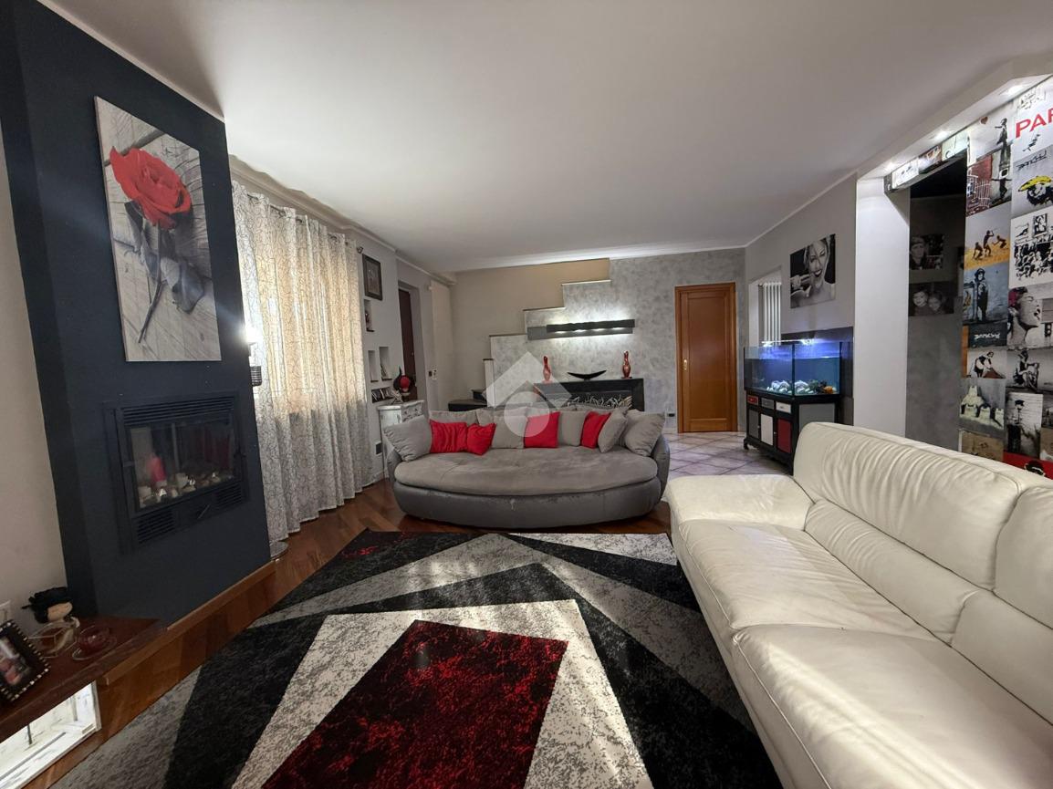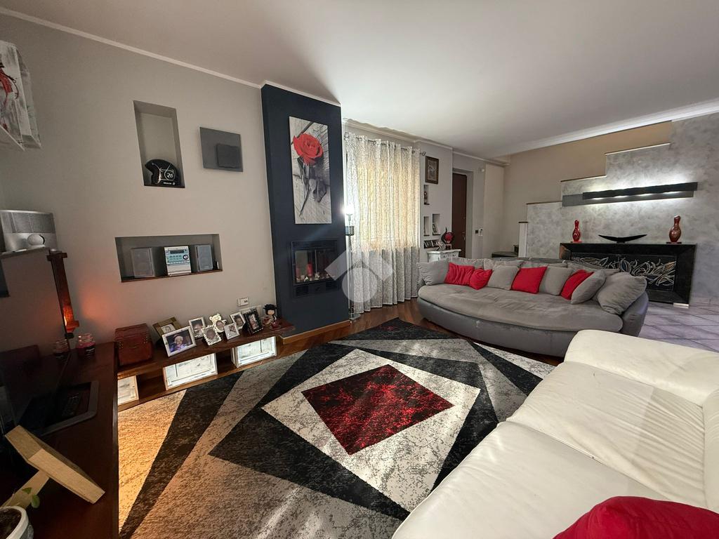 La villa è di recente costruzione e libera su tre lati. E' situata in una zona residenziale tranquilla e circondata dal verde. L'ingresso pedonale affaccia sul cortile privato e una scalinata accompagna alla porta di ingresso, quest'ultima affaccia sul salone ampio e luminoso dotato anche di camino, questo è diviso dalla cucina che è abitabile e spaziosa e dotata di accesso diretto al giardino con dehor, ottimo per mangiare fuori nei periodi più caldi. Al piano principale è presente anche una cameretta utilzzata come studio. Il bagno è finestrato e di servizio. Al piano primo la zona notte è dotata di tre camere da letto, un bagno e una lavanderia. La camera più ampia è matrimoniale e dotata di porta finestra che la collega direttamente al balcone. Le due camerette sono singole, una più ampia con l'accesso al balcone e una più piccola mansardata. Il bagno è finestrato e dotato sia di vasca che di doccia. Al piano seminterrato la taverna è ampia.