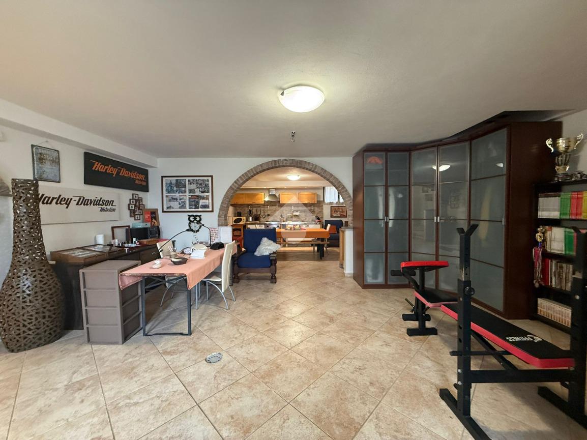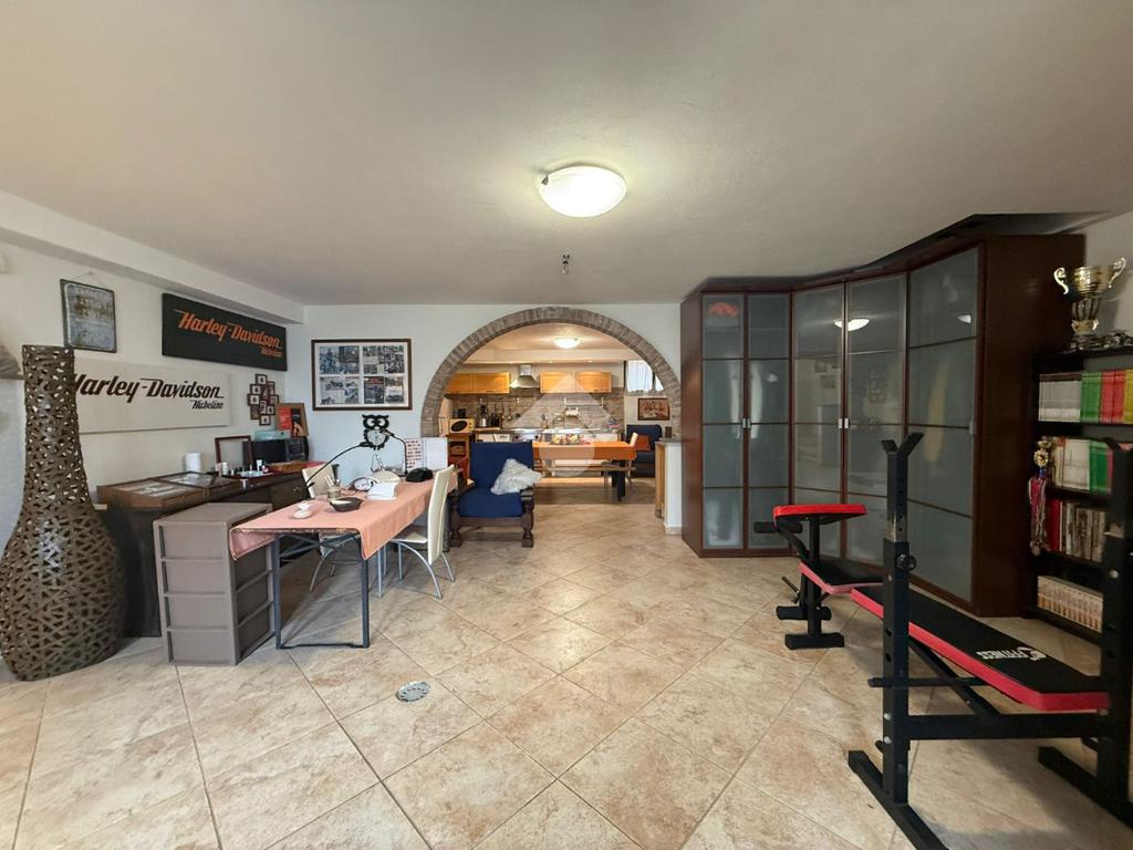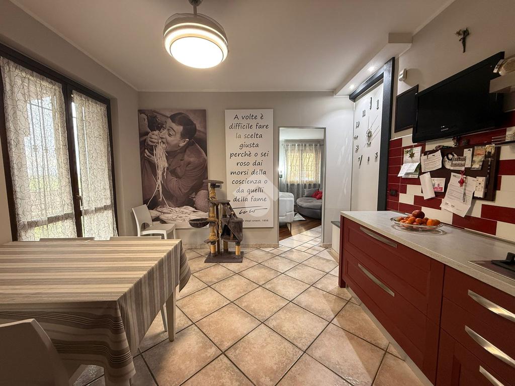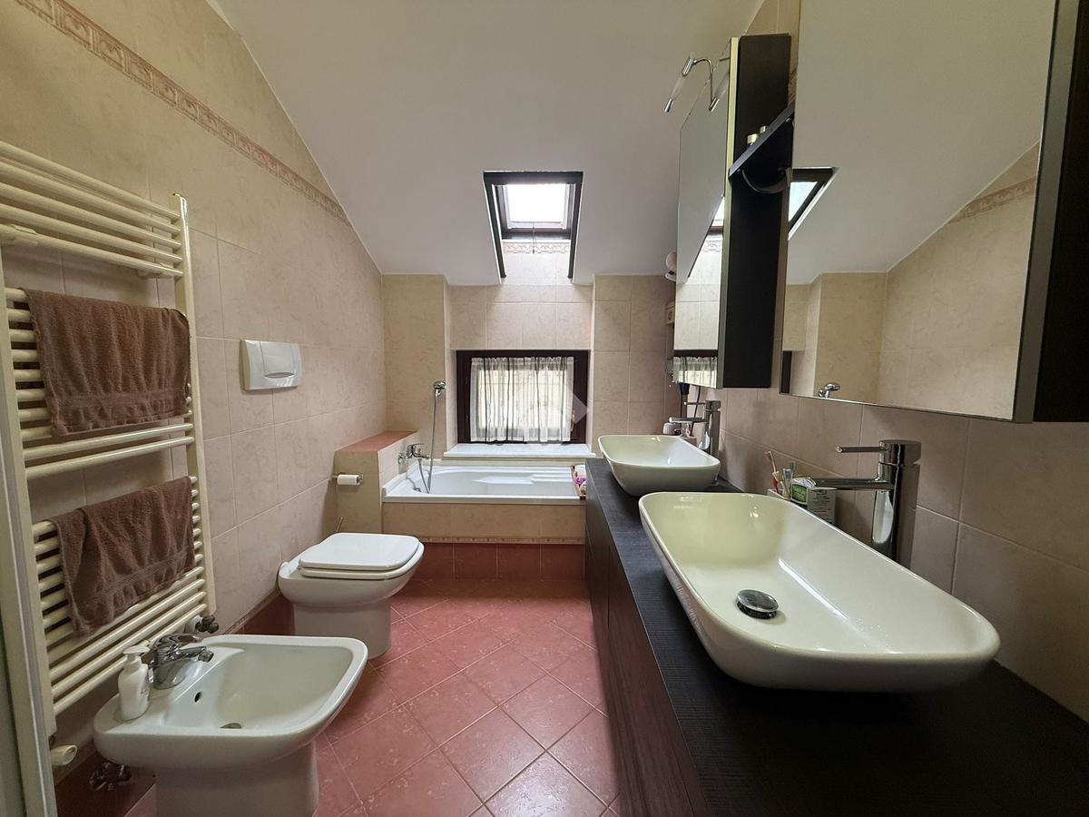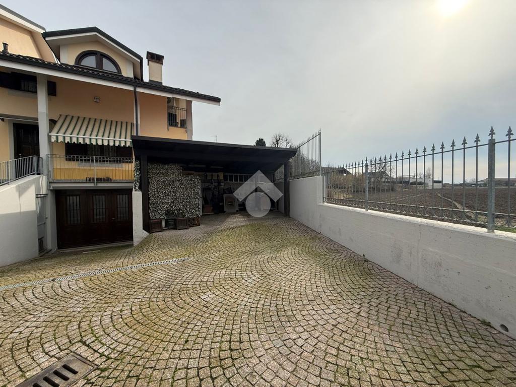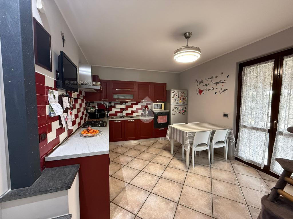 La villa è di recente costruzione e libera su tre lati. E' situata in una zona residenziale tranquilla e circondata dal verde. L'ingresso pedonale affaccia sul cortile privato e una scalinata accompagna alla porta di ingresso, quest'ultima affaccia sul salone ampio e luminoso dotato anche di camino, questo è diviso dalla cucina che è abitabile e spaziosa e dotata di accesso diretto al giardino con dehor, ottimo per mangiare fuori nei periodi più caldi. Al piano principale è presente anche una cameretta utilzzata come studio. Il bagno è finestrato e di servizio. Al piano primo la zona notte è dotata di tre camere da letto, un bagno e una lavanderia. La camera più ampia è matrimoniale e dotata di porta finestra che la collega direttamente al balcone. Le due camerette sono singole, una più ampia con l'accesso al balcone e una più piccola mansardata. Il bagno è finestrato e dotato sia di vasca che di doccia. Al piano seminterrato la taverna è ampia.