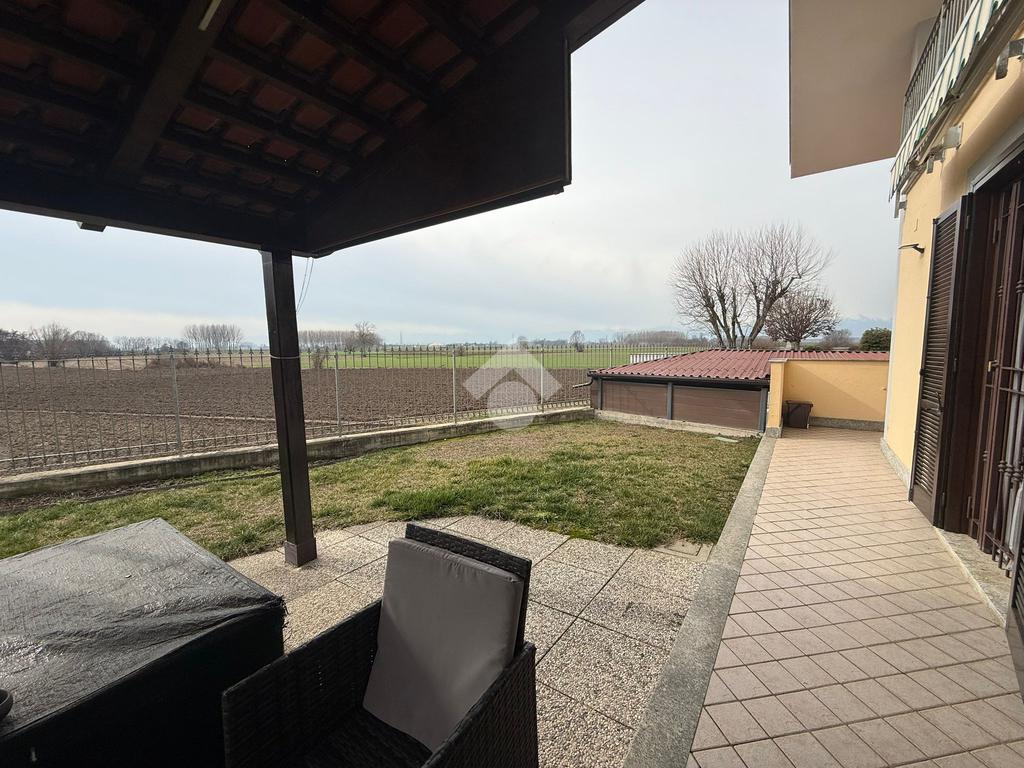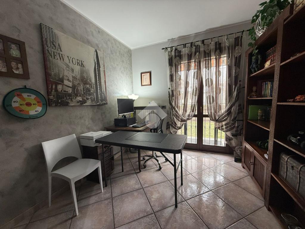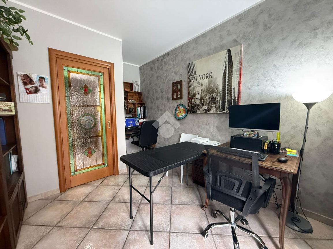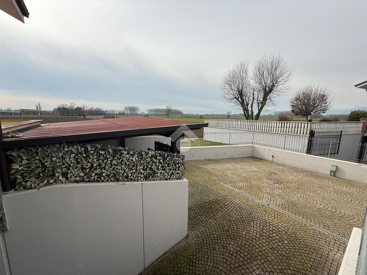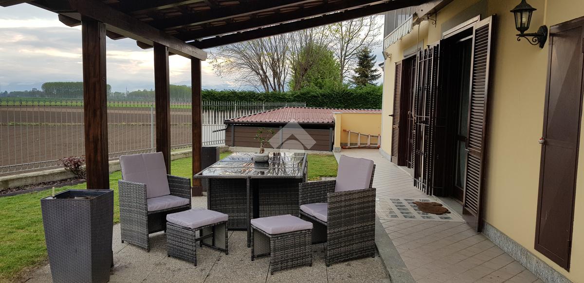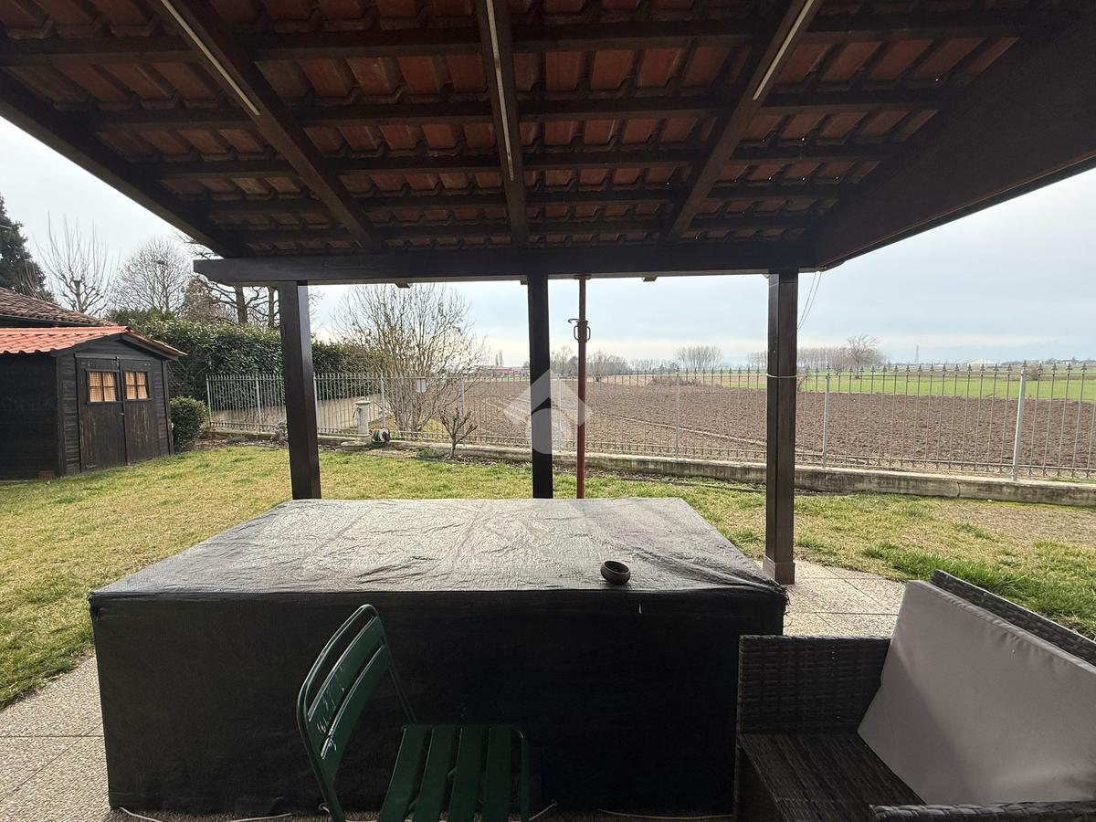La villa è di recente costruzione e libera su tre lati. E' situata in una zona residenziale tranquilla e circondata dal verde. L'ingresso pedonale affaccia sul cortile privato e una scalinata accompagna alla porta di ingresso, quest'ultima affaccia sul salone ampio e luminoso dotato anche di camino, questo è diviso dalla cucina che è abitabile e spaziosa e dotata di accesso diretto al giardino con dehor, ottimo per mangiare fuori nei periodi più caldi. Al piano principale è presente anche una cameretta utilzzata come studio. Il bagno è finestrato e di servizio. Al piano primo la zona notte è dotata di tre camere da letto, un bagno e una lavanderia. La camera più ampia è matrimoniale e dotata di porta finestra che la collega direttamente al balcone. Le due camerette sono singole, una più ampia con l'accesso al balcone e una più piccola mansardata. Il bagno è finestrato e dotato sia di vasca che di doccia. Al piano seminterrato la taverna è ampia.
